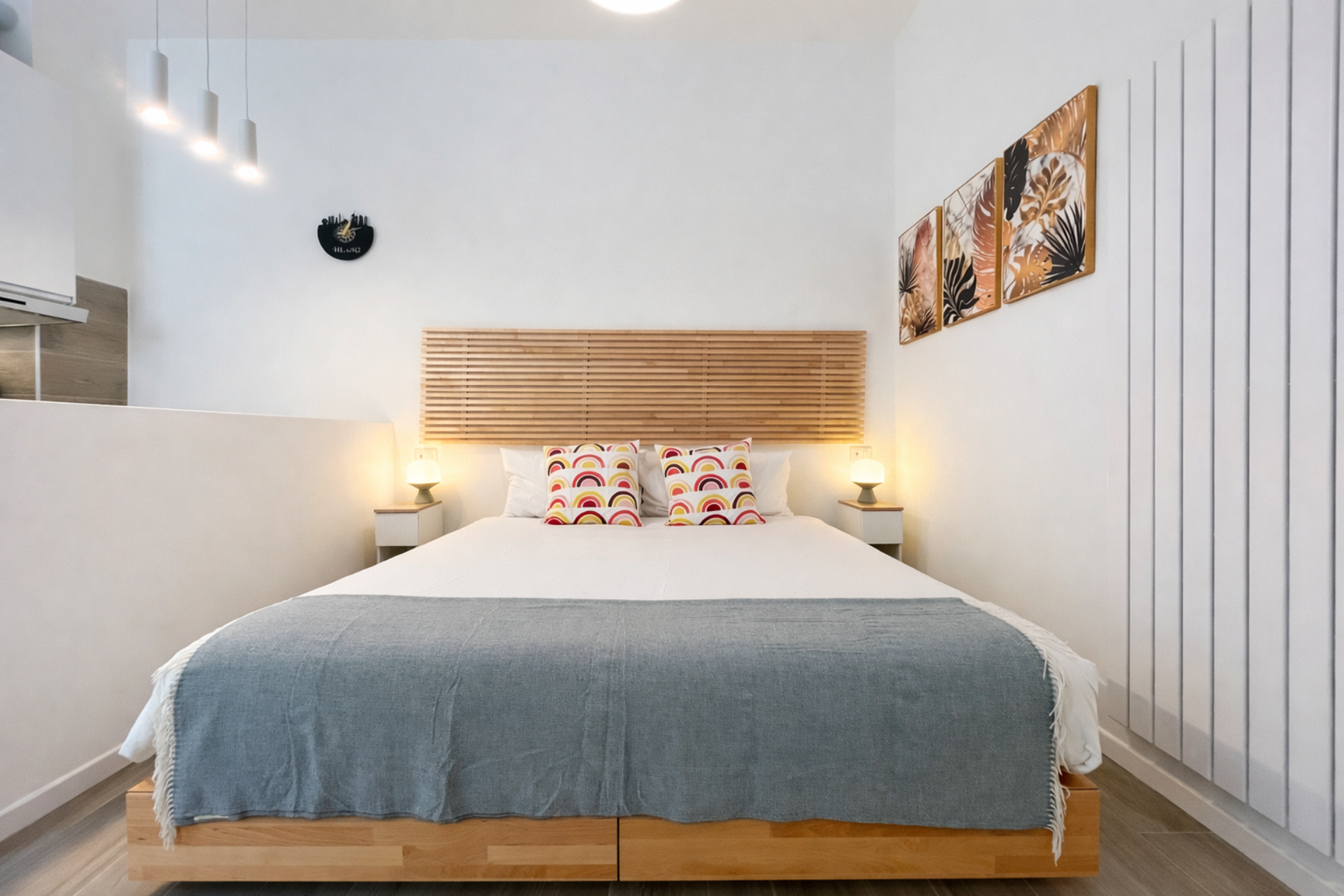 The room is furnished with wardrobe and mirror, 2 bedside tables with lamps, top and high stools for the kitchen, 42'' 4K Smart TV in the bedroom and 20" UHD TV in the kitchenette, air conditioning, wi-fi.